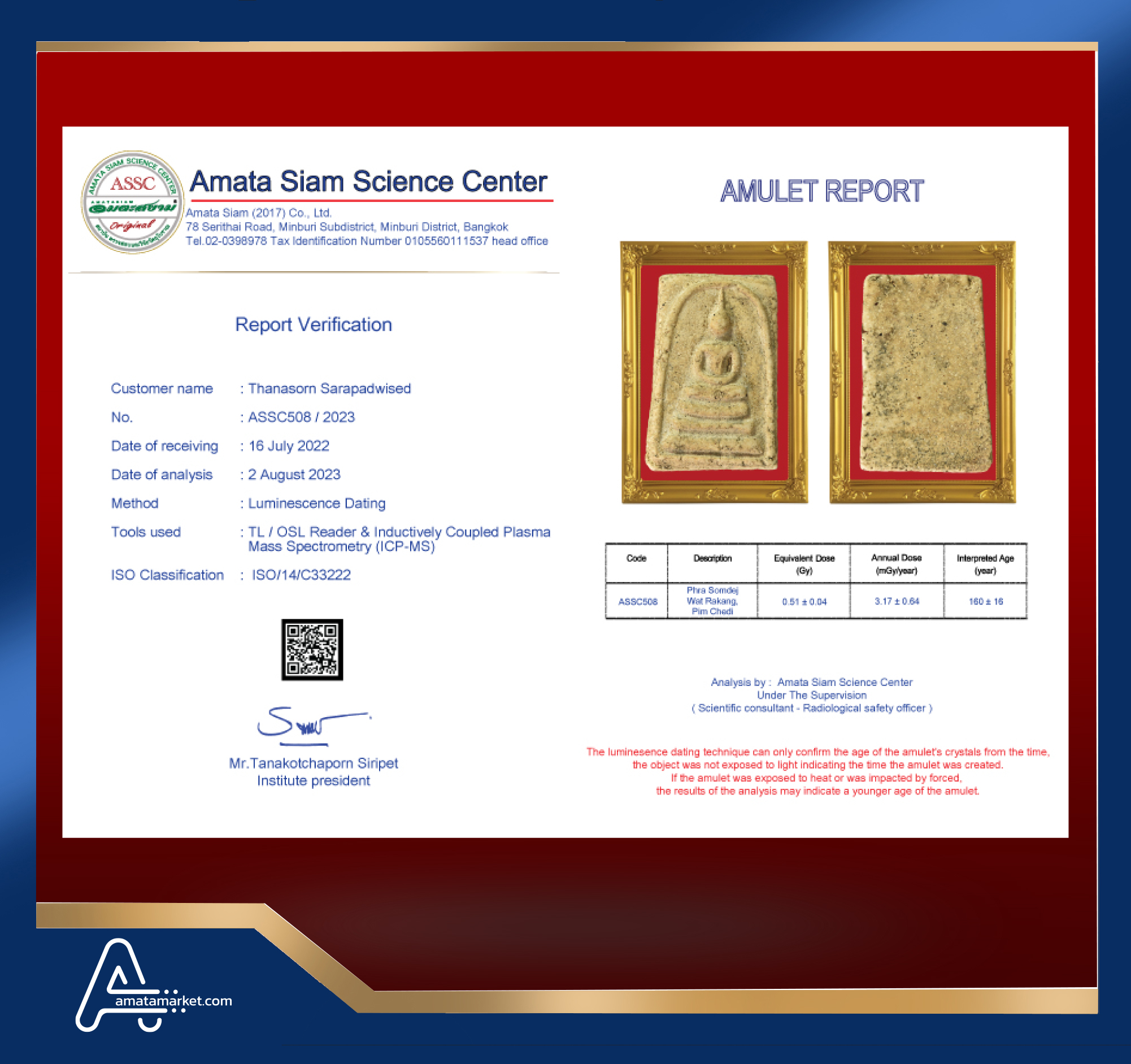 พระสมเด็จ องค์นี้ตรวจอายุสัมบูรณ์ด้วยเทคนิคการเปล่งแสง โดยมีค่าปริมาณรังสีสะสมจากเครื่อง Lexsyg Research TL/OSL Reader และมีอัตราการแผ่รังสีต่อปีจากความเข้มข้นของธาตุกัมมันตรังสีที่วัดโดยเครื่อง Laser Ablation Inductively Coupled Plasma Mass Spectrometry (LA-ICPMS)  ซึ่งอายุสัมบูรณ์ที่คำนวณได้จากกระบวนวิทยาศาสตร์สอดคล้องกับประวัติศาสตร์การสร้างพระสมเด็จของเจ้าประคุณสมเด็จพระพุฒาจารย์ (โต พรหมรังสี)